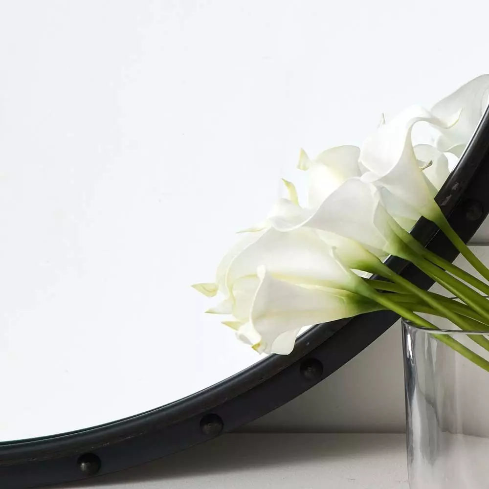 A simple round mirror made from metal with stud detail on the frame. Ideal in the bathroom, bedroom or living room. Mirrors are a perfect way to make a space look larger and reflect light into a room.