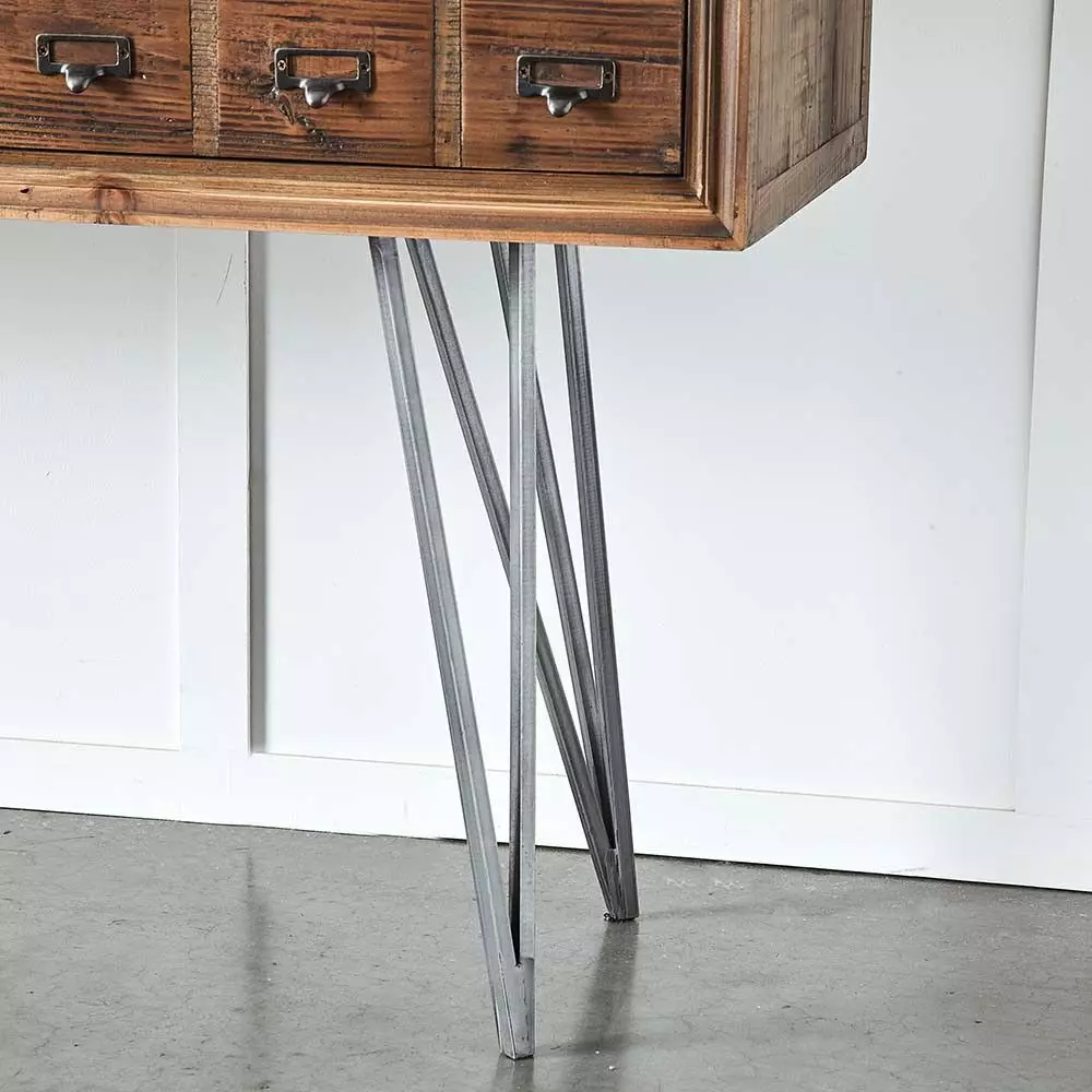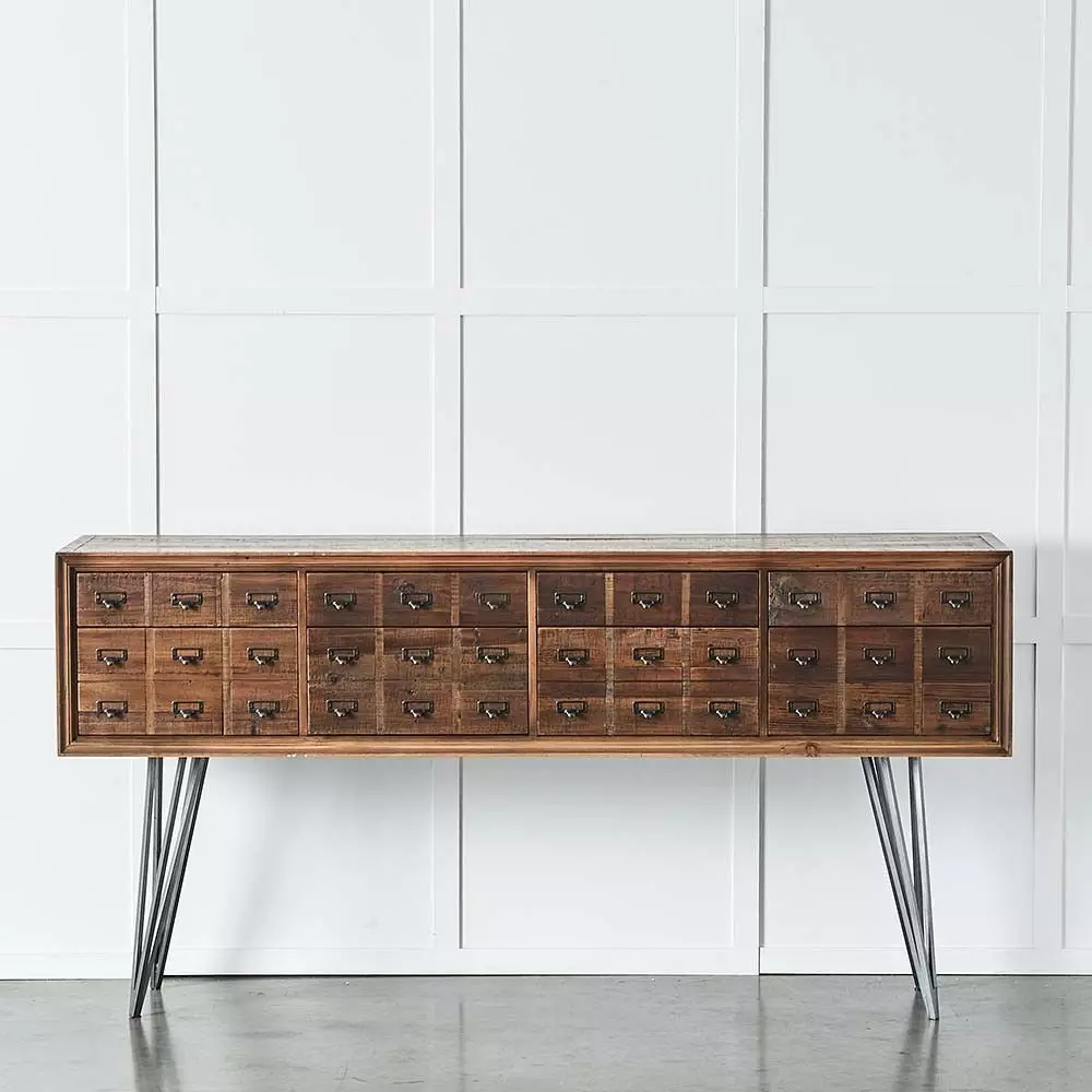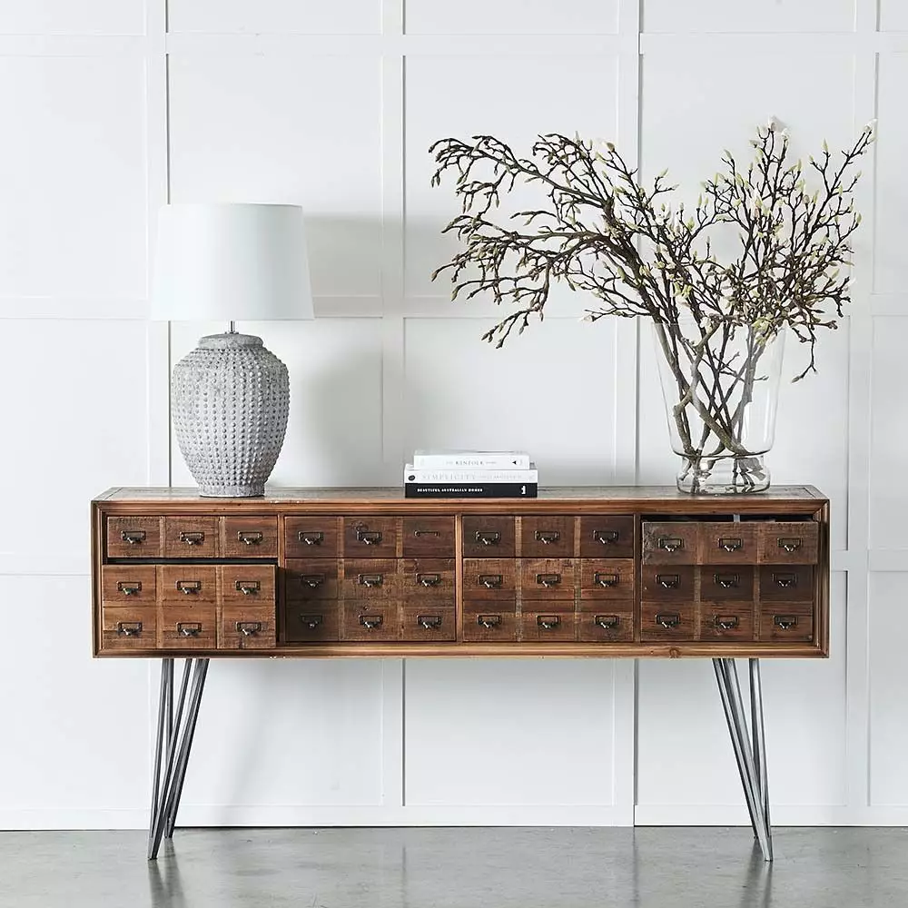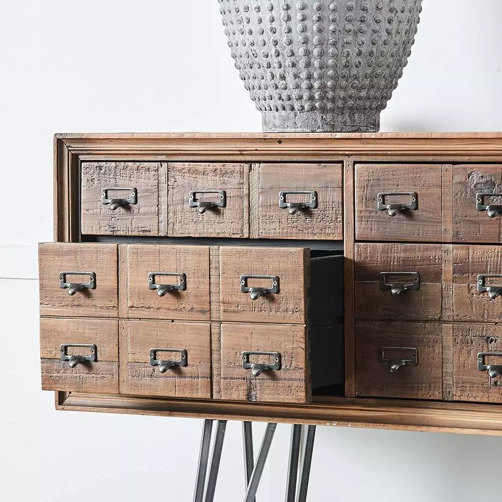 The distinctive Arden console table is crafted from reclaimed fir and finished with iron door handles and V-shaped legs. While it looks like a lot of small drawers, it actually has three narrow drawers along the top and 3 deeper drawers underneath, so storage is not compromised. It’s the perfect statement piece of furniture for a living room or hallway.