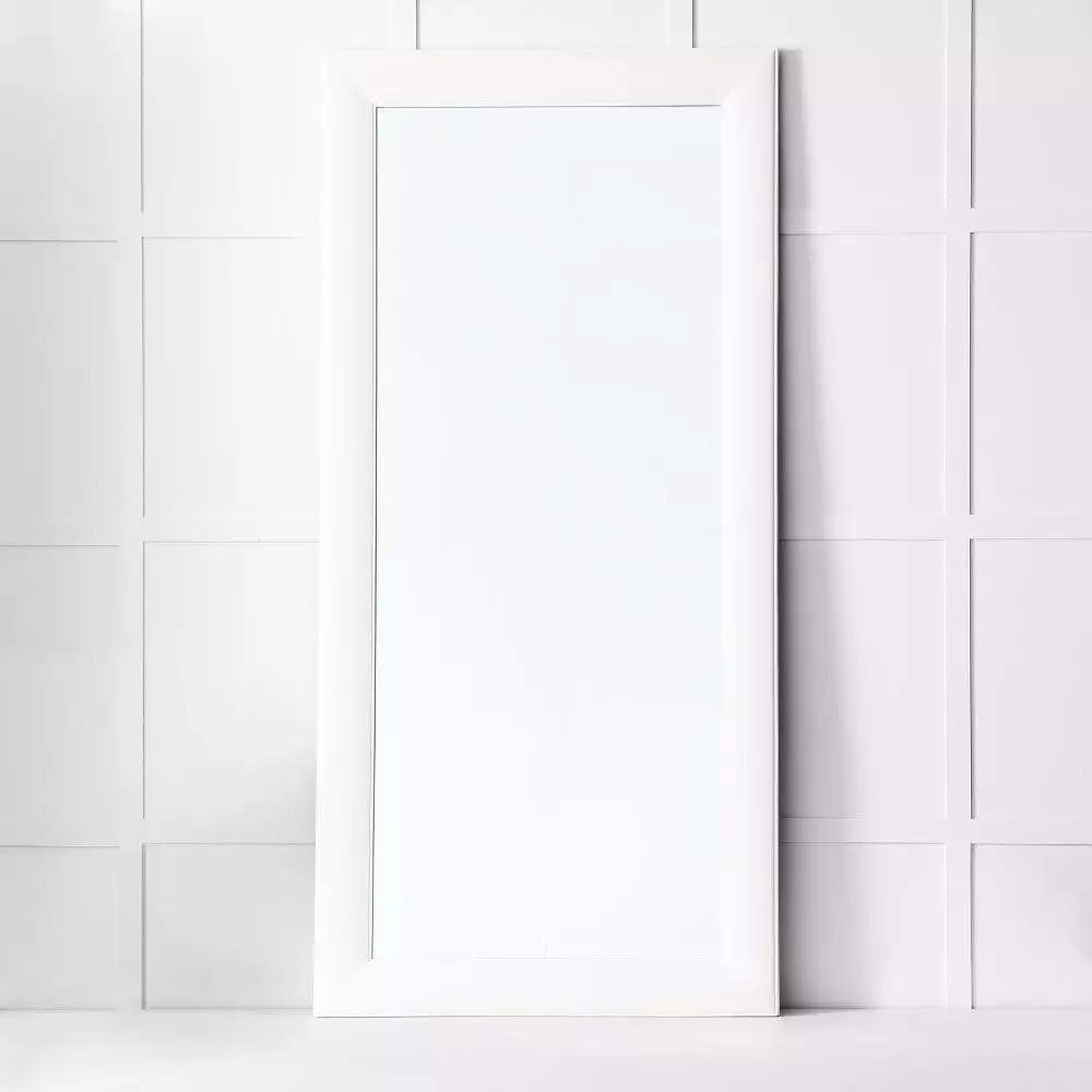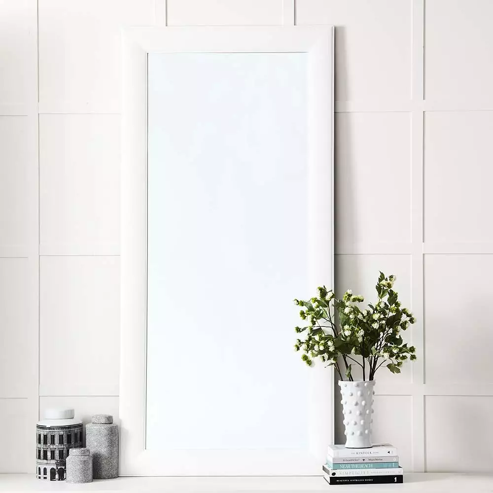 The thick white frame adds a point of reference to this large mirror. It will make a statement in any room or hallway.