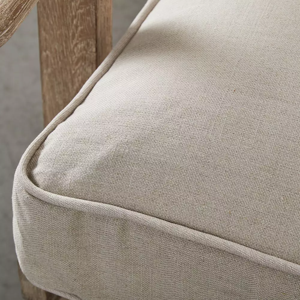 The back and seat cushions have a foam core with a covering of feather and polyester, and are upholstered in natural linen with piping for definition.