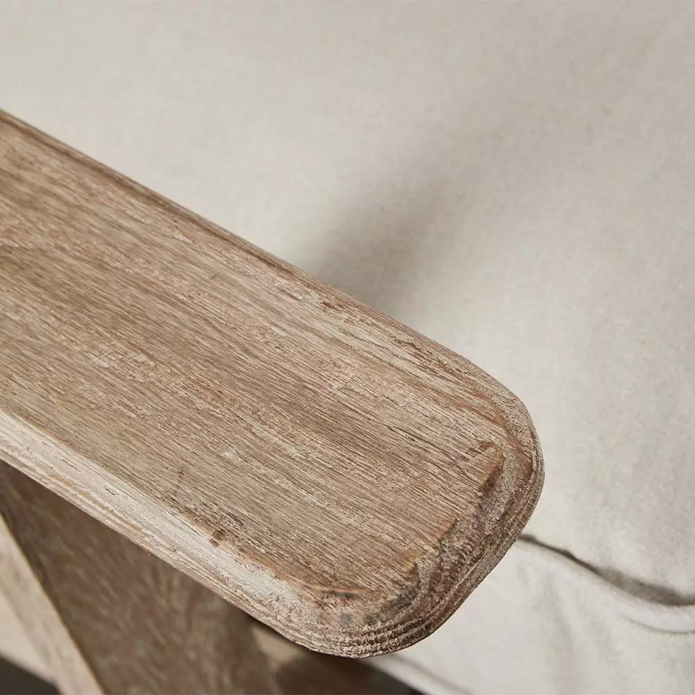 A relaxed armchair with a leisurely feel with warmth of the timber enhancing the upholstered linen cushions.