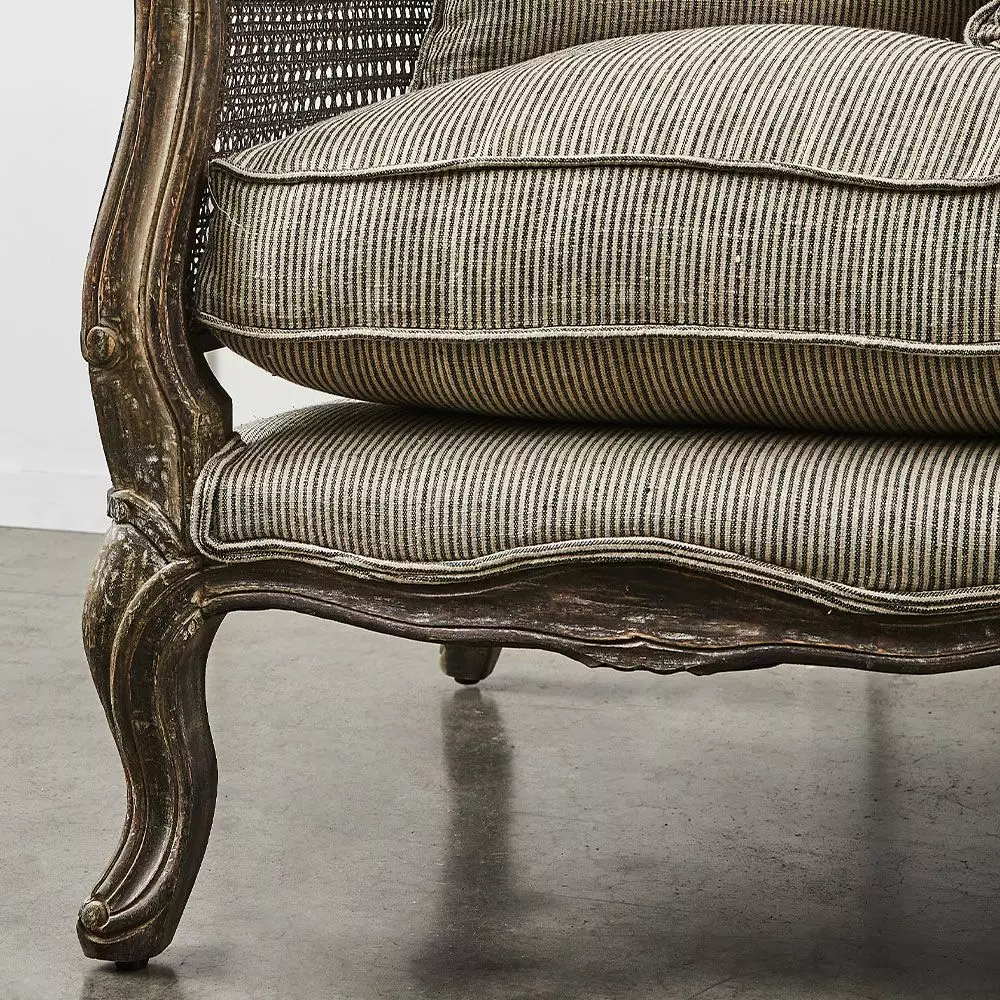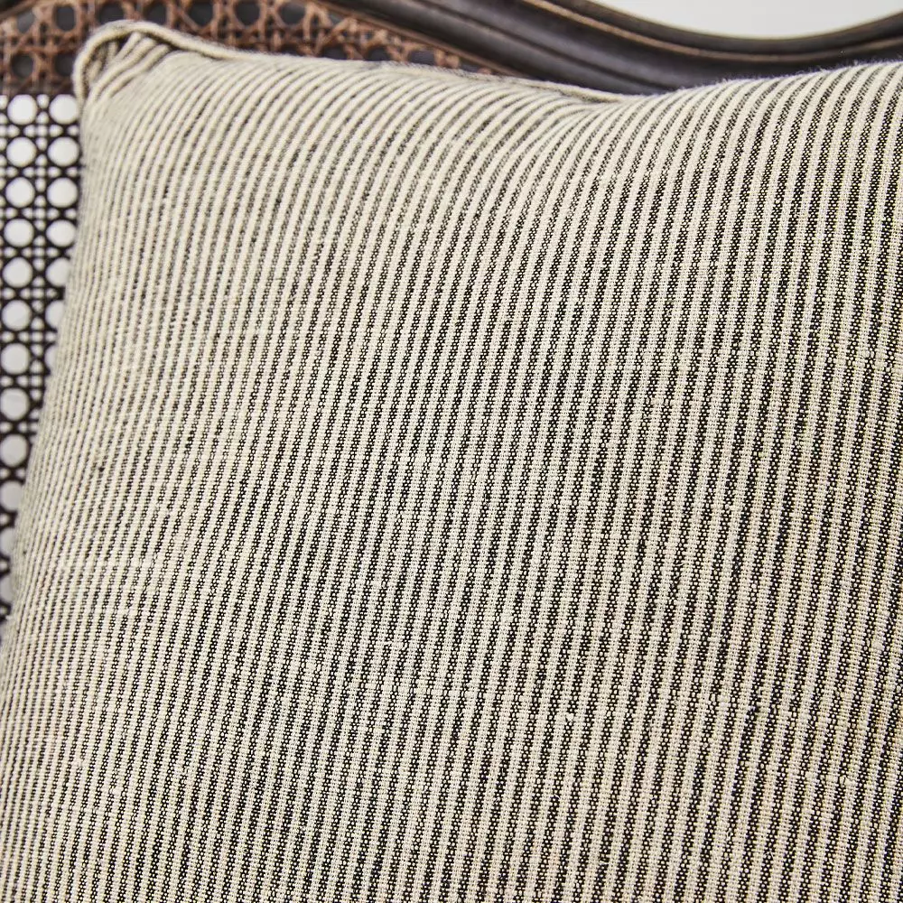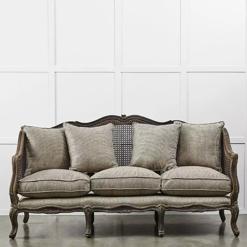 Vintage meets contemporary with this gorgeous sofa. A beautifully carved Mango Wood frame with woven rattan sides and back makes the base for the sofa and then there are the upholstered cushions in a natural and graphite striped linen which give it a more contemporary feel.