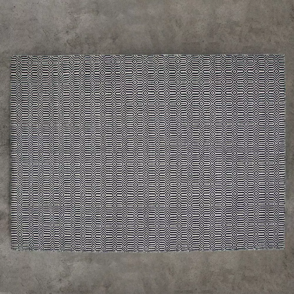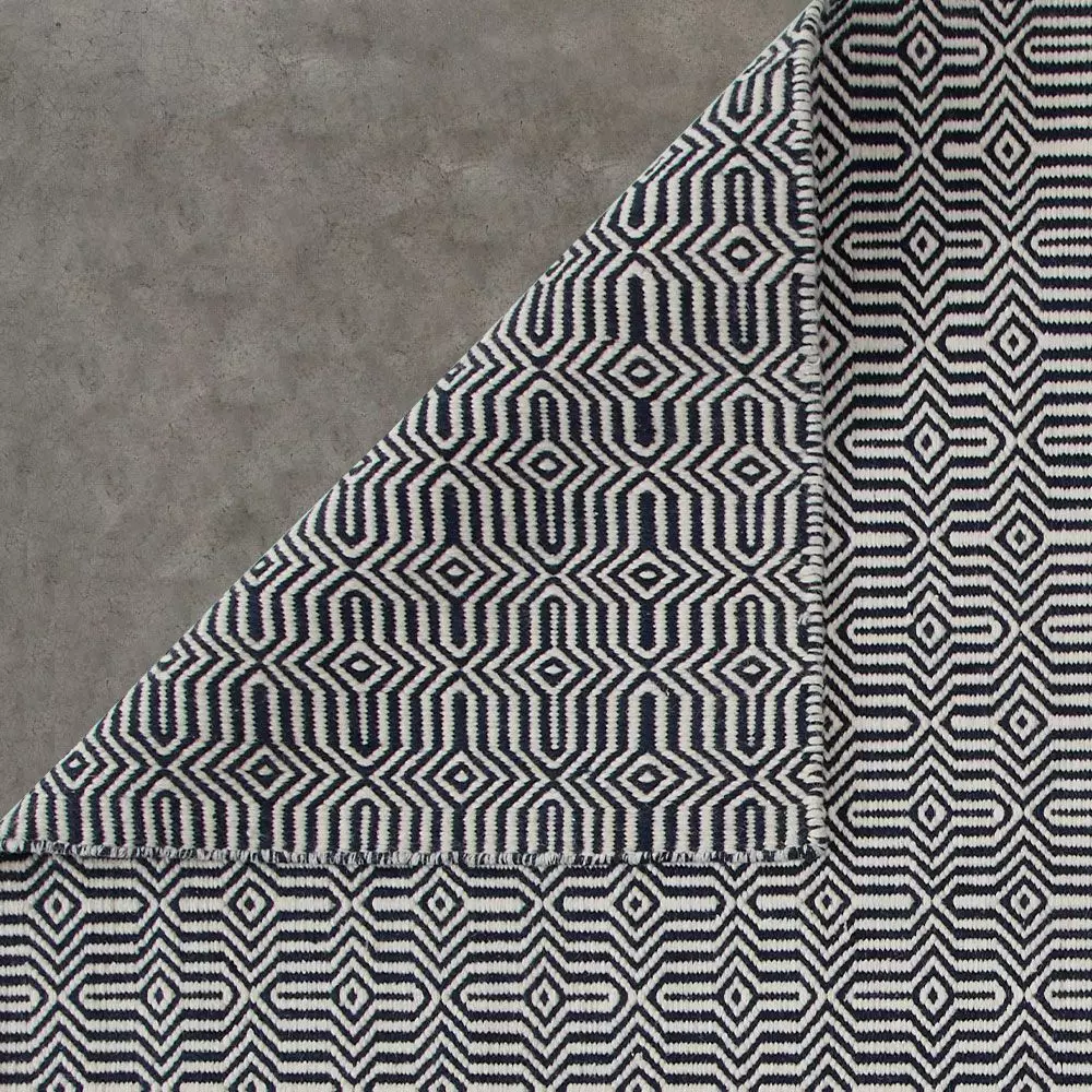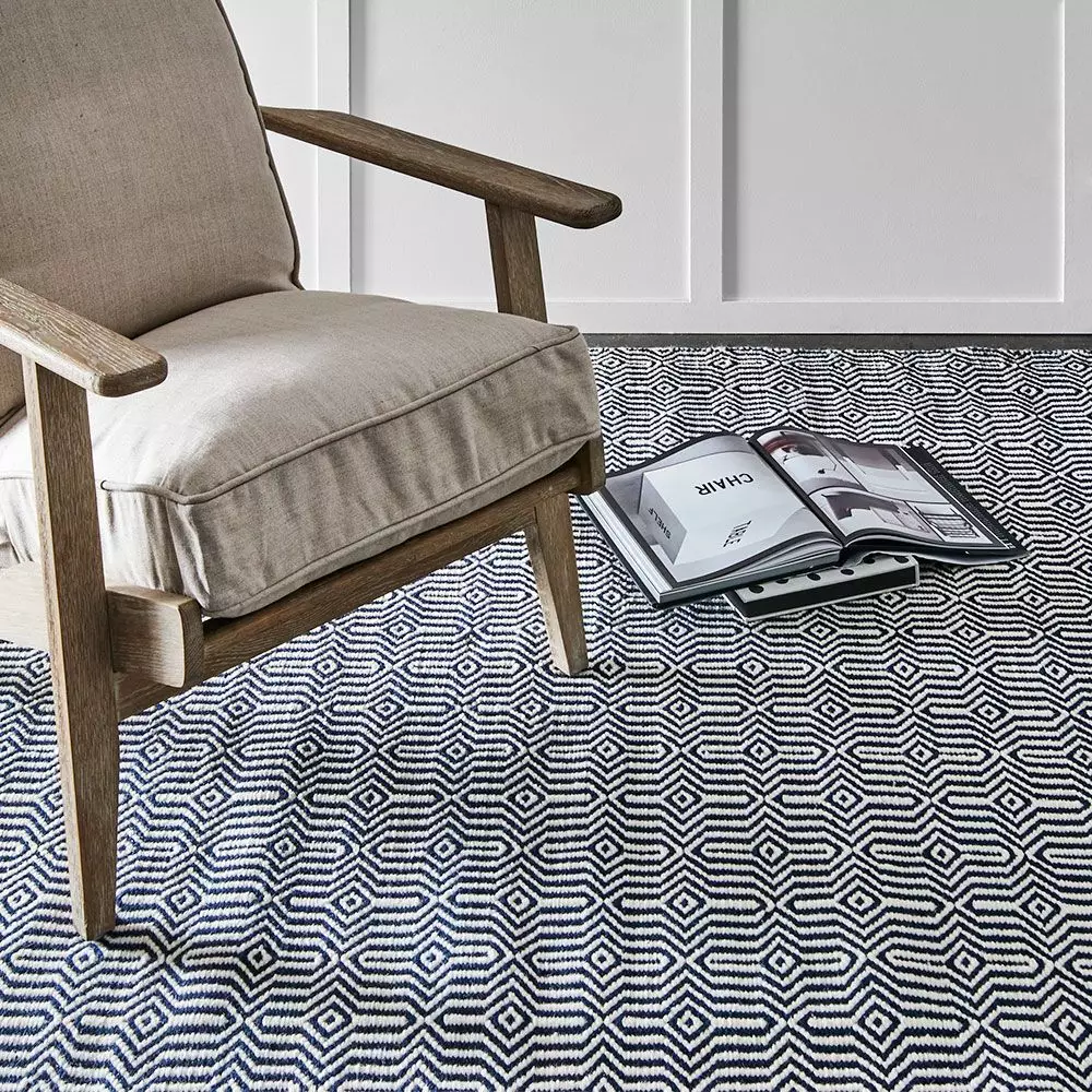 A woven wool rug in a dramatic geometric print in classic navy and ivory. The perfect rug to ground any room.