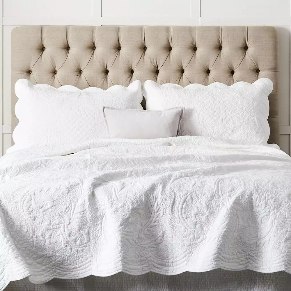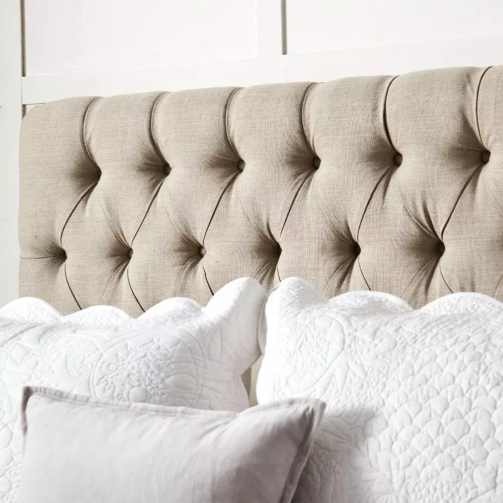 Our Isabelle bedhead will create a focal point in the bedroom. This superbly crafted bedhead is upholstered in 100% linen, padded and with traditional hand tucking and buttoning and finished with oak legs. A classic bedhead which is available in Queen and King sizes and a range of beautiful colours.