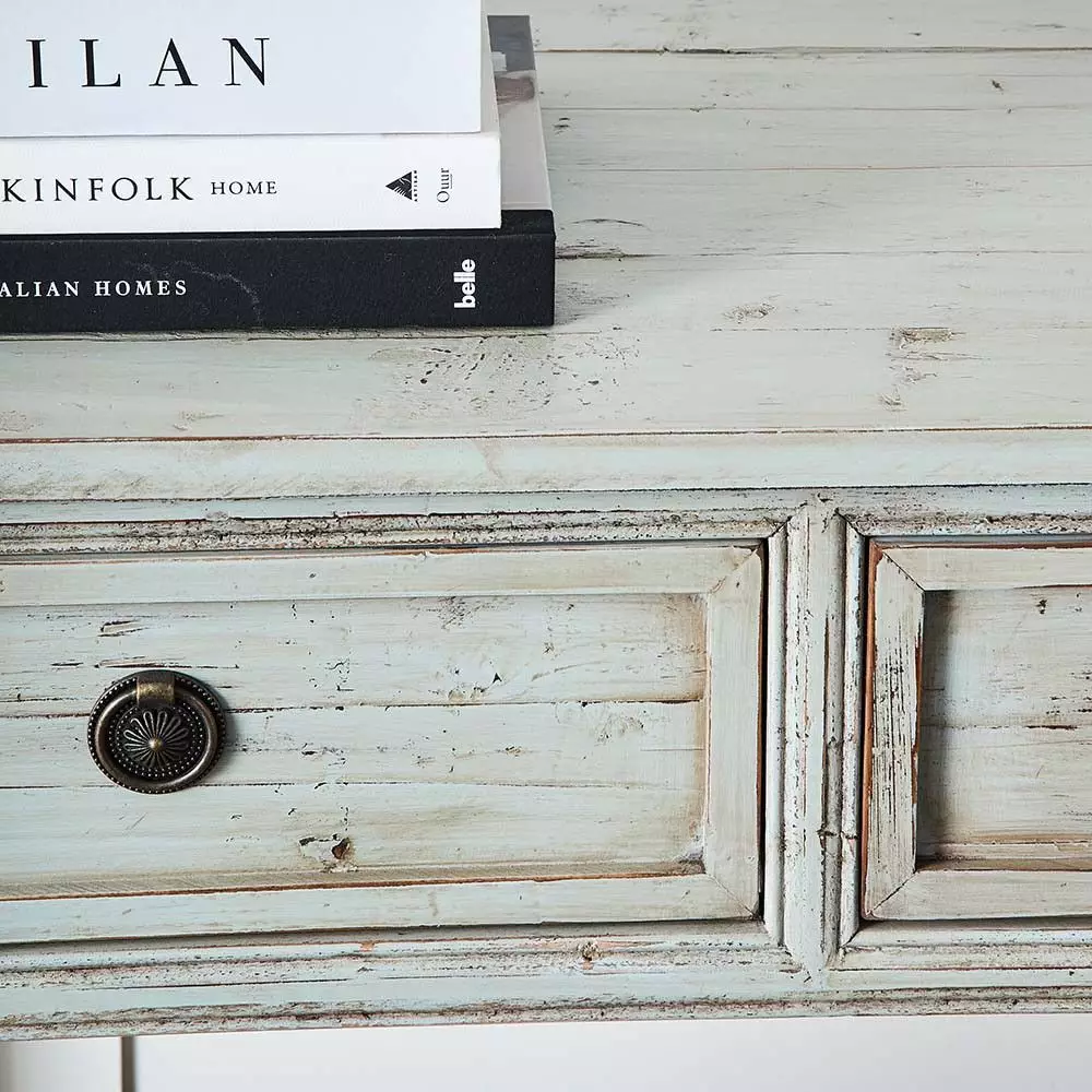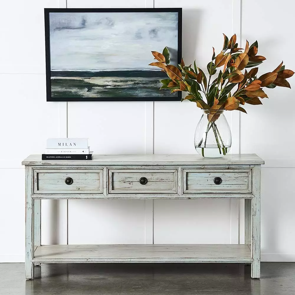 This versatile console table is handcrafted from reclaimed pine and finished in an antique blue/grey patina. It’s sure to be a focal point no matter where its placed. Use it as a room divider behind your sofa, along a wall or as a hall console table. The 3 substantial drawers and a handy shelf complete the console.