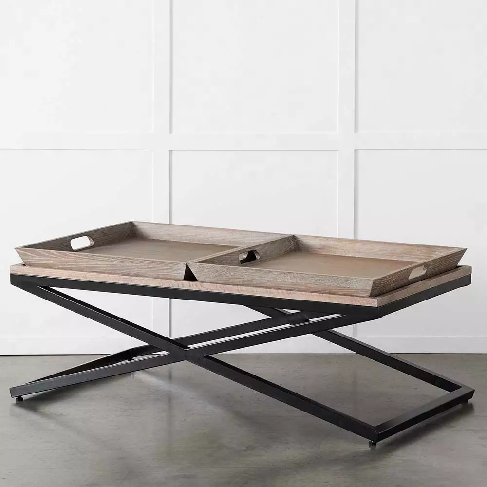 The Oleg coffee table with its crossed metal legs and rectangular top with the two square trays on the top is a welcome addition to our range of coffee tables. Constructed from oak and black metal legs it will fit easily into a contemporary home but at the same time with its soft oak colour, into a more traditional environment.