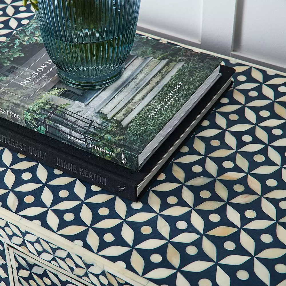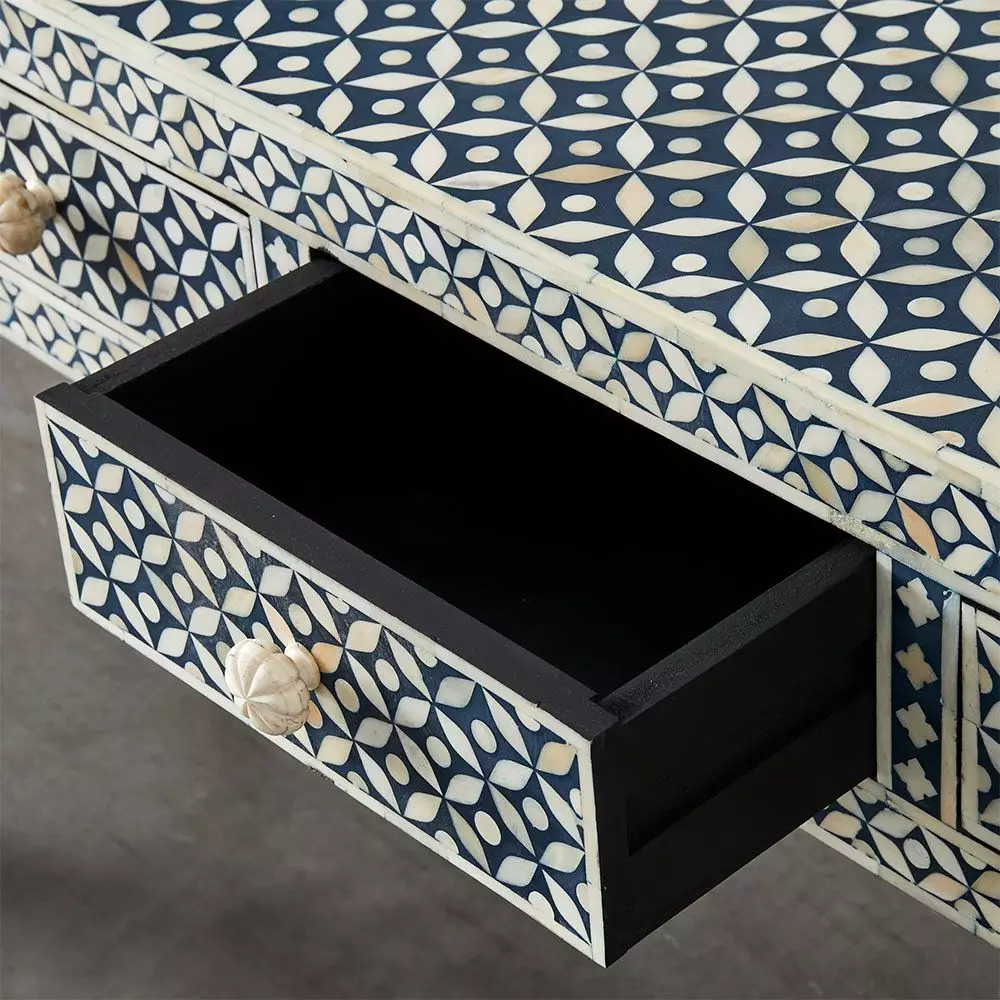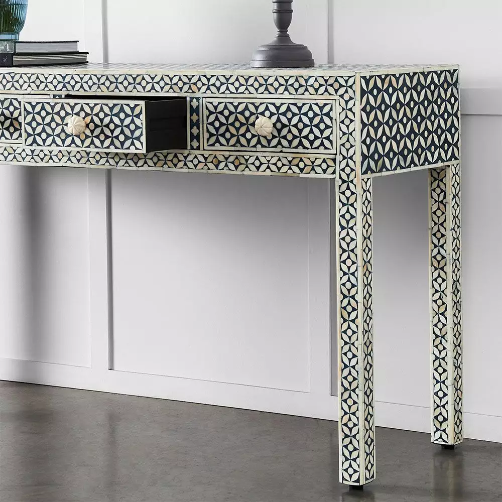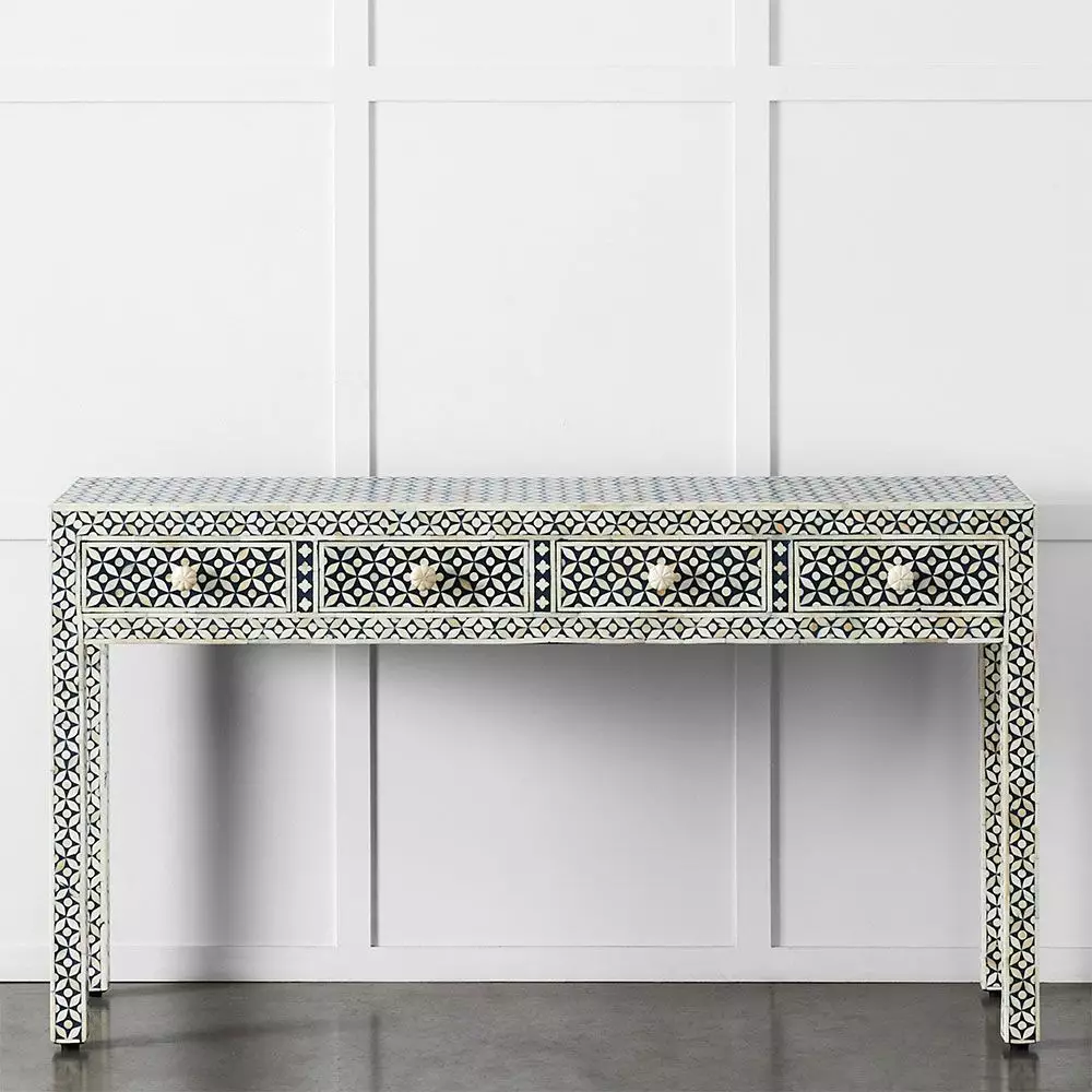 A striking console table crafted from ethically sourced bone and a navy coloured resin.
