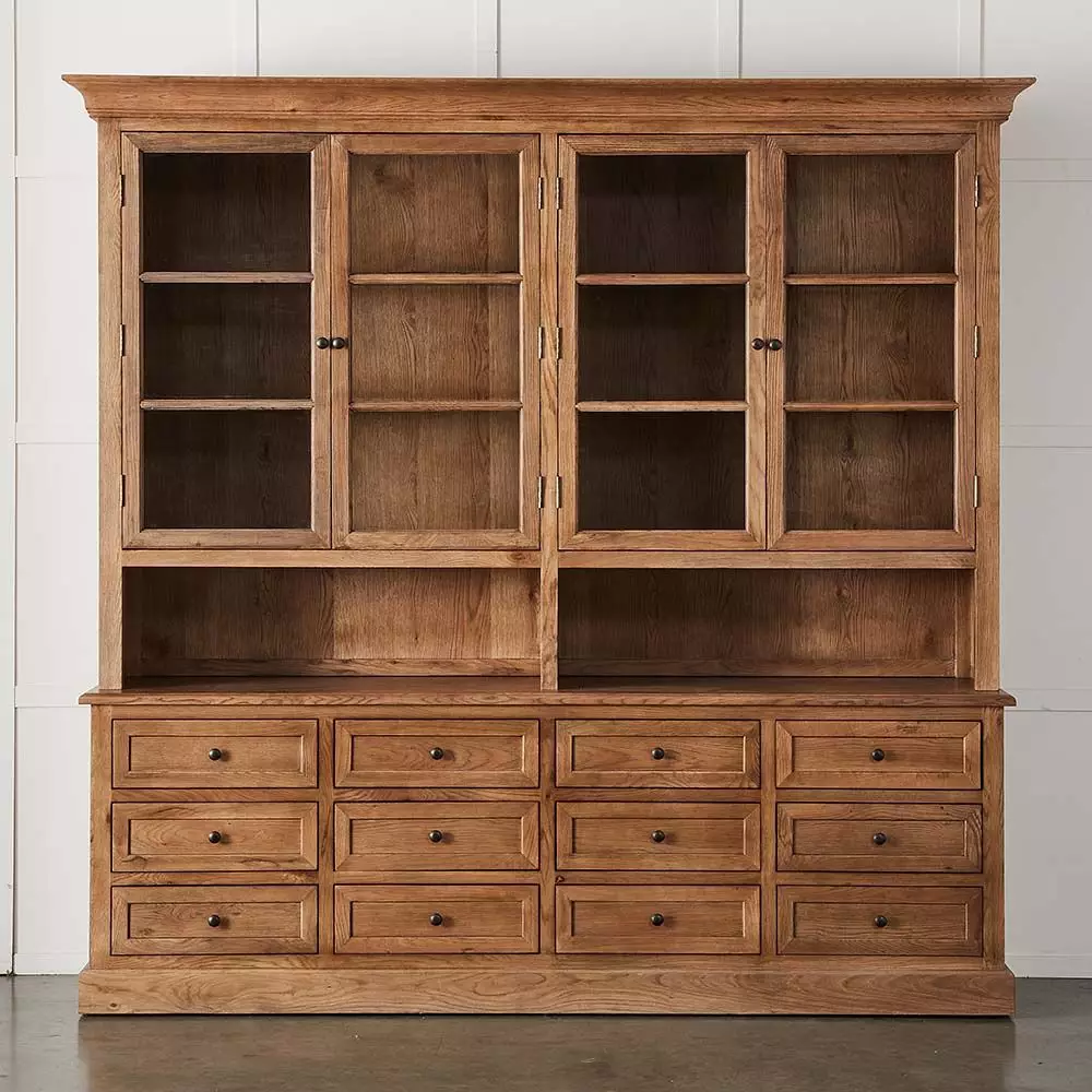 The elegant oak Rochester buffet and Hutch has all storage options covered with 12 handy drawers to keep things neat and tidy while being out of sight but easy to access. Two open compartments give access to items used all the time and the slightly blue hued, tempered glass doors in front of 3 shelves will keep treasures dust free but on display. Beautifully crafted from oak. It comes in two pieces for easier transportation and access into homes.