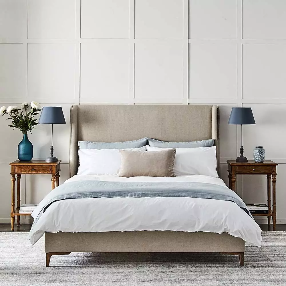 Serena is a stylish addition to our range of beds. Beautifully upholstered in 100% natural linen, with narrow shaped sides finished with piping. The sides are large enough to give interest but not big enough to be claustrophobic. The bed is grand but with no foot board it is not overpowering and will not overtake smaller rooms. The lovely oak legs complete the bed perfectly. Available in Queen and King sizes